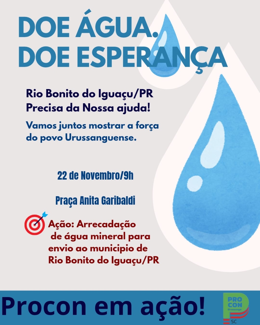 A mobilização solidária é realizada pelo Procon, em parceria com a Defesa Civil, Secretaria de Assistência Social, com o apoio das demais entidades e autoridades. “A situação em Rio Bonito do Iguaçu é muito delicada, e entendemos que a água potável é uma das necessidades mais urgentes. Contamos com a solidariedade dos urussanguenses para ajudar quem está enfrentando esse momento difícil”, destaca a coordenadora do Procon, Tatiane da Costa.