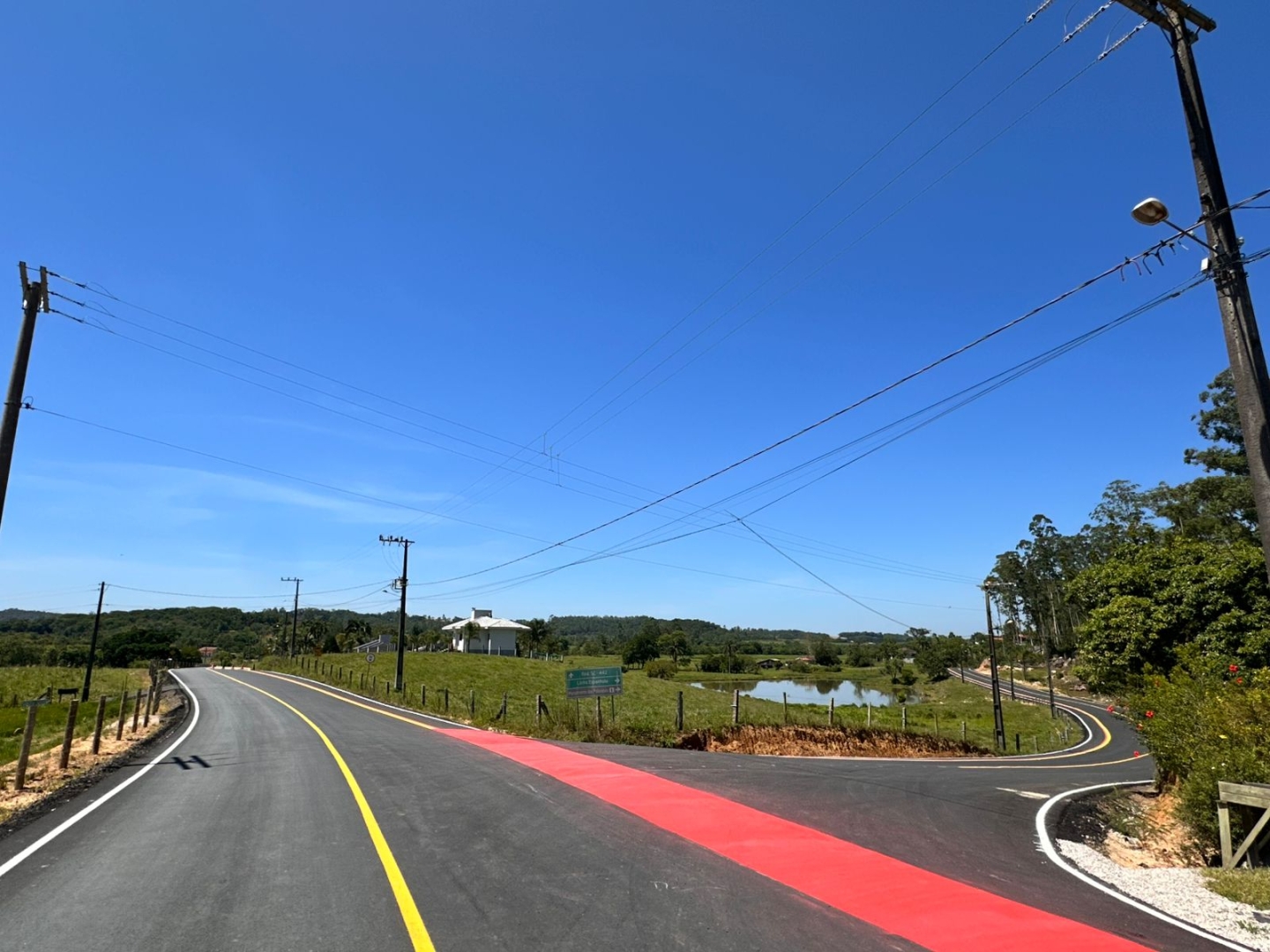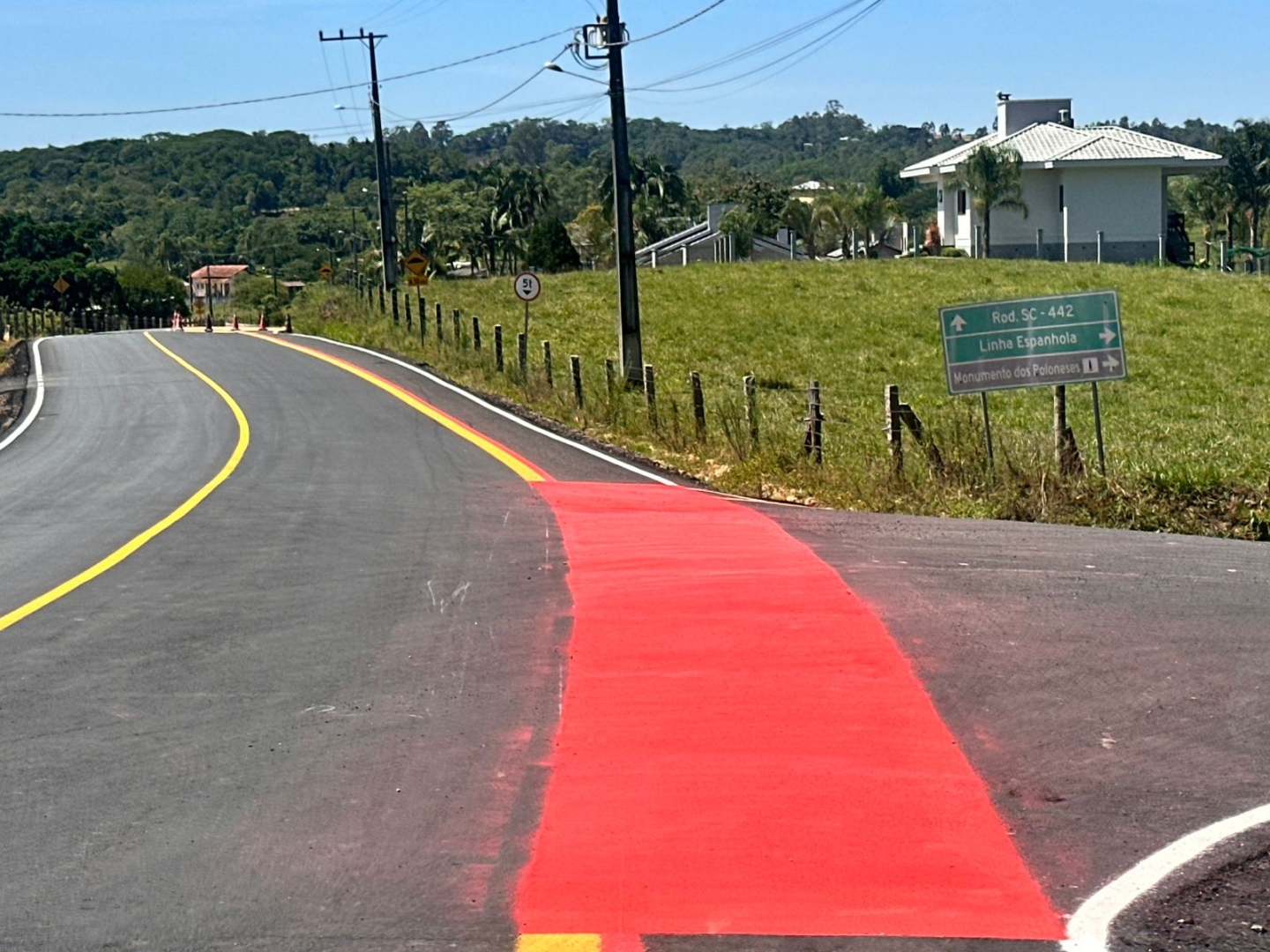 A pavimentação de 1.500 metros entre a Linha Espanhola e o limite com Morro da Fumaça foi concluída com pintura horizontal, ciclovia e todos os acabamentos necessários para uso seguro da população.