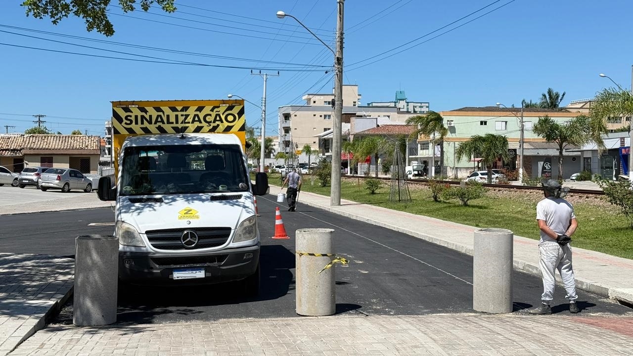 Sinalização horizontal está sendo feita na rua Primo Ítalo Naspolini e Avenida Inocente Pagnan, estacionamento no local está bloqueado