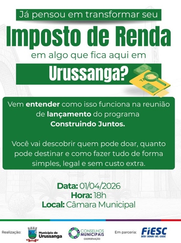 O Governo Municipal de Urussanga, por meio da Coordenação dos Conselhos, realiza nesta quarta-feira, dia 1, a apresentação do Programa Construindo Juntos, às 18 horas, na Câmara de Vereadores. A iniciativa visa ampliar o investimento social no município por meio da declaração do Imposto de Renda. A assessora da Federação da Indústria do Estado de Santa Catarina (FIESC) Regional Litoral Sul, Cintia Nowasco da Silva, vai participar da apresentação.