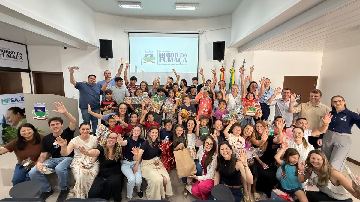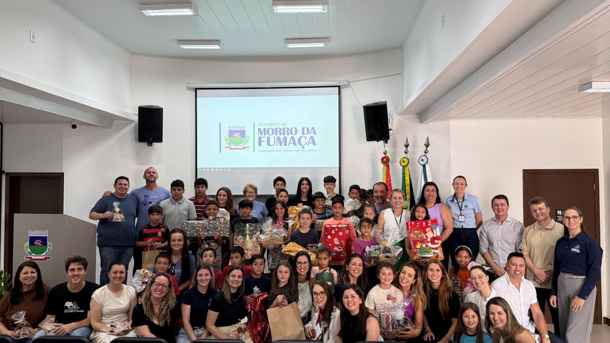 Nesta quarta-feira, 10 de dezembro, o espírito natalino encheu de alegria, embrulhos e laços de fita o Salão de Atos Octávio Naspolini com a entrega de presentes da ação Natal Solidário para as crianças e adolescentes atendidos pelo Serviço de Convivência e Fortalecimento de Vínculos (SCFV) fumacense. Em dois encontros, durante a manhã e à tarde, os padrinhos e madrinhas puderam conhecer e entregar os presentes para seus afilhados e afilhadas, em um momento de celebração, emoção e magia. As 93 cartinhas foram adotadas por servidores do Governo Municipal, da Polícia Civil e da Câmara de Vereadores do município.